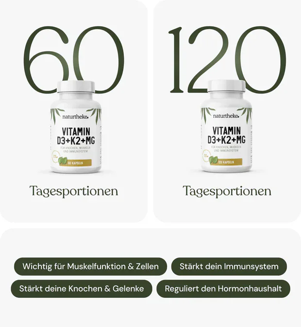 Dein Triopräparat mit den Vitaminen D3 & K2, kombiniert mit Magnesium.
